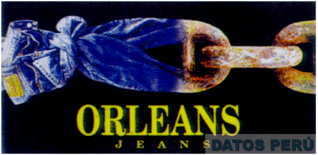 LA DENOMINACION ORLEANS JEANS ESCRITA EN LETRAS CARACTERISTICAS DE COLOR AMARILLO, EN LA PARTE SUPERIOR LA FIGURA DE UN PANTALON AMARRADO QUE CONTINUA CON UNOS ESLABONES OXIDADOS; CONFORME AL MODELO ADJUNTO,