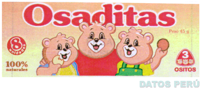 LA DENOMINACION OSADITAS EN LETRAS ROJAS Y ESCRITA SOBRE LA FIGURA DE TRES OSITOS SONRIENTES ABRAZADOS, EN LA COMBINACION DE COLORES AMARILLO, MARRON CLARO, VERDE, ROJO, CELESTE Y AMARILLO; AL LADO INFERIOR DERECHO SE APRECIA UN LOGOTIPO FORMADO POR EL NUMERO 3 Y LAS CABEZAS DE TRES OSITOS SONRIENTES, CONFORME AL MODELO ADJUNTO,
