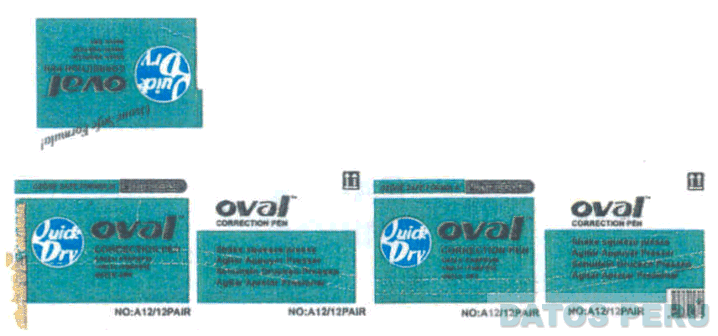La caja empaque conformada por la denominación OVAL CORRECTION PEN escrita en letras características; acompañada por la frase QUICK DRY dentro de una figura circular, así como frases alusivas al producto; todo en los colores verde, blanco, plomo, negro y celeste; conforme al modelo adjunto