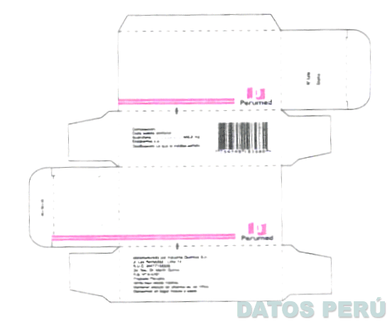 Un empaque conformado por figuras rectangulares de color blanco con bordes de color negro, en el lado inferior derecho se aprecia la denominación PERUMED escrita en letra características en color negro, así como la figura de una bandera de color rojo Pantone (1795 C) con la letra P estilizada de color blanco, al lado izquierdo de la denominación PERUMED, se aprecian dos franjas de color rojo Pantone (1795C); conforme al modelo adjunto
