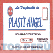 El logotipo conformado por un marco color rojo y azul, conteniendo la denominación PLASTI ANGEL escrita en letras características de color azul, debajo de la cual se aprecian dos líneas horizontales, una de color azul y la otra de color rojo, en la parte superior izquierda se aprecia una figura irregular de color rojo con las letras P.A en su forma característica de color blanco y con borde de color azul, en la parte superior derecha se aprecia la figura de una bolsa de color rojo y blanco y frases alusivas al producto; conforme al modelo adjunto