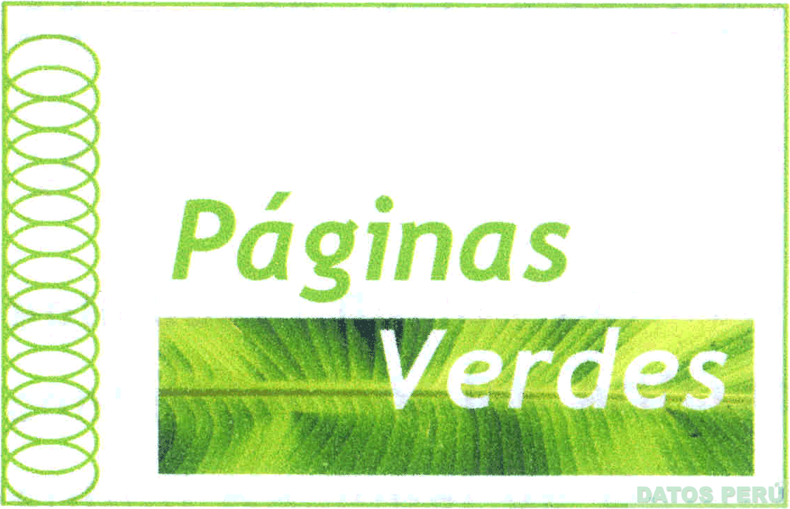 El logotipo conformado por la denominación PÁGINAS VERDES escrita en letras características, en donde el término VERDES se ubica dentro de un rectángulo, todo a su vez dentro de una figura rectangular, apreciándose al lado izquierdo diversas figuras circulares superpuestas, en la combinación de colores blanco y verde en diversas tonalidades; conforme al modelo adjunto