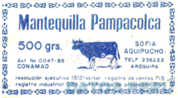 La etiqueta que contiene la denominación PAMPACOLCA y figura de vaca en los colores azul y blanco, conforme al modelo adjunto