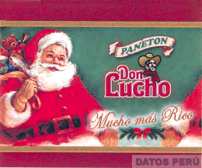 La etiqueta que contiene la figura de papá noel, el término PANETÓN dentro de una franja ondulada, la denominación DON LUCHO escrita en letras características y la figura de la cabeza de un chalán, asimismo, debajo se aprecia la frase MUCHO MÁS RICO y un lazo sobre una guirnalda navideña, todo en la combinación de colores