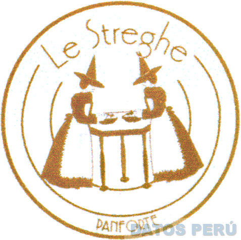LA DENOMINACION PANFORTE LE STREGHE ESCRITA EN LETRAS CARACTERISTICAS DENTRO DE UNA FIGURA GEOMETRICA CIRCULAR EN CUYA PARTE CENTRAL SE ENCUENTRA LA FIGURA DE DOS BRUJITAS CON DOS PLATOS SOBRE UNA MESA, TODO EN COLOR DORADO, CONFORME AL MODELO ADJUNTO,