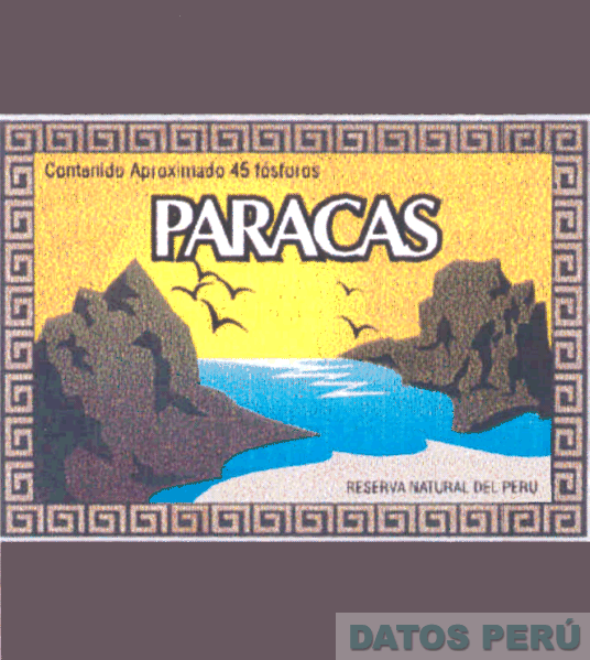 La etiqueta con la denominación PARACAS y la representación de un paisaje marino, con rocas a ambos lados, gaviotas volando, todo al interior de un recuadro con bordes de diseño característico; en los colores beige, anaranjado, amarillo, marrón, celeste, blanco y negro; conforme al modelo adjunto