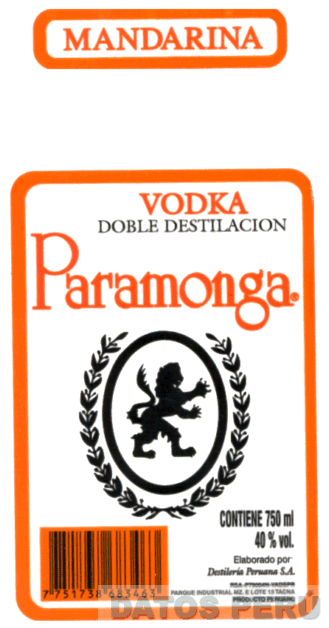 LA ETIQUETA RECTANGULAR CON BORDES DE COLOR ANARANJADO CONTENIENDO LA FIGURA DE UN LEON HERALDICO ENCERRADO EN UN OVALO BORDEADO DE LAURELES Y LA DENOMINACION PARAMONGA ESCRITA EN LETRAS CARACTERISTICAS EN COLOR ANARANJADO Y ENCIMA LAS DENOMINACIONES VODKA ESCRITA EN LETRAS DE COLOR ANARANJADO Y DOBLE DESTILACION EN COLOR NEGRO; EN LA PARTE SUPERIOR APARECE UN RECTANGULO CON BORDES DE COLOR ANARANJADO CONTENIENDO LA DENOMINACION MANDARINA ESCRITA EN COLOR ANARANJADO, CONFORME AL MODELO