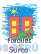 El logotipo conformado por la denominación PARQUES DE SURCO escrita en letras características y la representación estilizada de dos bloques de edificios con ventanas, dos en cada edificio, con fondo color azul cielo, la figura del sol y césped, con una flor color rojo, en la combinación de colores rojo, amarillo, azul, blanco y verde; conforme al modelo adjunto