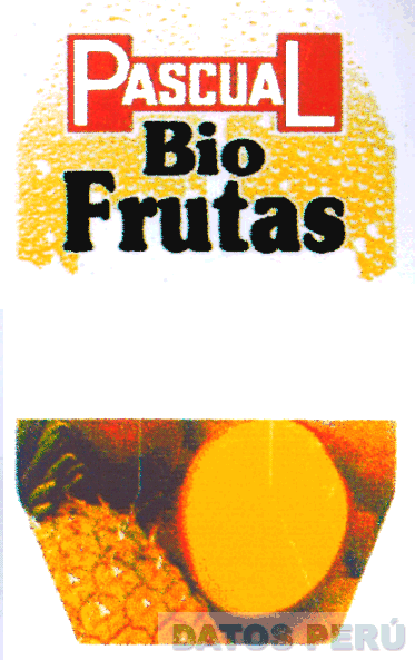 LA ETIQUETA OCTAGONAL QUE CONTIENE EN LA PARTE SUPERIOR LA DENOMINACION PASCUAL BIO FRUTAS, EN LETRAS CARACTERISTICAS, Y EN LA PARTE INFERIOR, EL DISEÑO DE FRUTAS, RESALTANDO ENTRE ELLAS EL DISEÑO DE UNA PIÑA Y EL DE UN DURAZNO, TODO EN LOS COLORES ROJO, AMARILLO, VERDE, BLANCO, MARRON Y ANARANJADO, CONFORME AL FACSIMIL ADJUNTO,