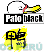 El logotipo conformado por la denominación PATO BLACK escrita en letras características, dentro de un rectángulo, en la parte superior se aprecia la figura estilizada de la cabeza de un pato, en la parte inferior se aprecia caracteres chinos sobre una figura irregular, todo en los colores blanco, negro, amarillo y rojo; conforme al modelo adjunto.