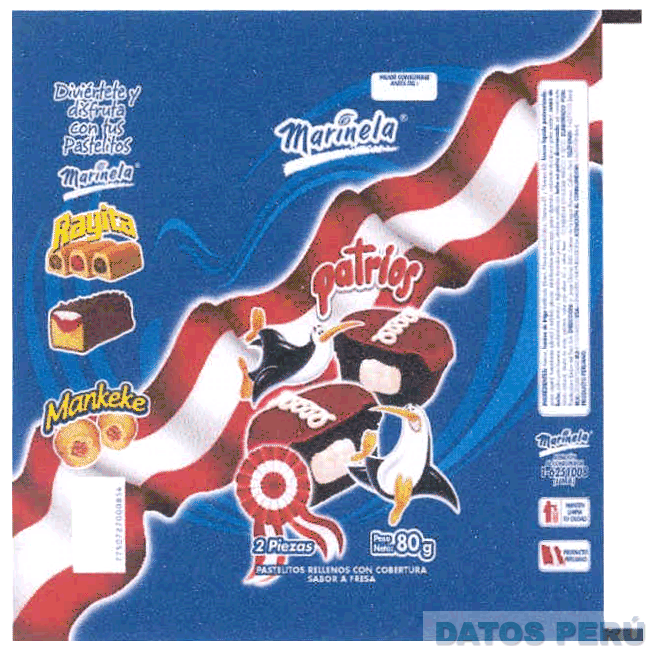La etiqueta que contiene varias figuras de kekes rellenos y las denominaciones MANKEKE, MARINELA y RAYITA escritas en letras características, asimismo, el término PATRIO sobre la figura de una banderola, acompañadas de figuras de pingüinos y demás elementos sin reivindicar, todo sobre un fondo de figuras de espirales y en los colores rojo, blanco, azul, celeste, amarillo, marrón y negro; conforme al modelo adjunto