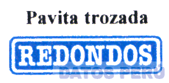 El logotipo conformado por la denominación REDONDOS escrita en letras características dentro de una figura de cuatro lados de bordes redondeados y en la parte superior la denominación PAVITA TROZADA escrita en letras características, todo en los colores azul, blanco y negro; conforme al modelo adjunto