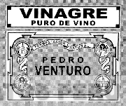 El logotipo conformado por la denominación PEDRO VENTURO escrita en letras características, la cual está contenida dentro de un marco ornamental donde se aprecian cuatro círculos, dos con la representación del frontis de una hacienda y dos con la representación de figuras humanas, en la parte superior la frase VINAGRE PURO DE VINO escrita en letras características y debajo de ésta la denominación FERMENTACION NATURAL escrita en letras características y dentro de una cinta, todo dentro de una figura cuadrangular y en los colores plomo, negro y blanco; conforme al modelo adjunto