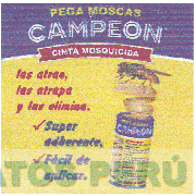 La denominación PEGA MOSCAS CAMPEON CINTA MOSQUICIDA LAS ATRAE LAS ATRAPA Y LAS ELIMINA, SUPER ADHERENTE, FACIL DE APLICAR y logotipo (se reivindica colores), conforme al modelo