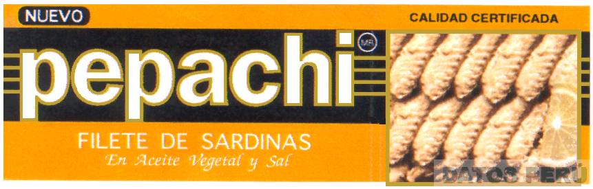 LA ETIQUETA CONFORMADA POR LA DENOMINACION PEPACHI ESCRITA EN LETRAS CARACTERISTICAS EN COLOR BLANCO Y DORADO, RODEADA POR CUATRO LINEAS DORADAS HORIZONTALES AL INICIO Y AL FINAL Y SOBREPUESTO A UNA FRANJA EN COLOR NEGRO A CUYOS LADOS SE APRECIAN DOS FRANJAS EN COLOR ANARANJADO, EN EL EXTREMO DERECHO SE APRECIA LA FRASE CALIDAD CERTIFICADA; CONFORME AL MODELO ADJUNTO