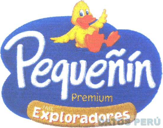 EL LOGOTIPO CONFORMADO POR LA FIGURA ESTILIZADA DE UN PATO SENTADO SOBRE UN SILLON, DEBAJO SE APRECIA LA DENOMINACION PEQUEÑIN PREMIUM ESCRITA EN LETRAS CARACTERISTICAS ASIMISMO SE APRECIA LA FIGURA SEMIOVAL CONTENIENDO LA DENOMINACION FASE EXPLORADORES, TODO EN LOS COLORES AMARILLO, ANARANJADO, AZUL, DORADO Y BLANCO; CONFORME AL MODELO ADJUNTO