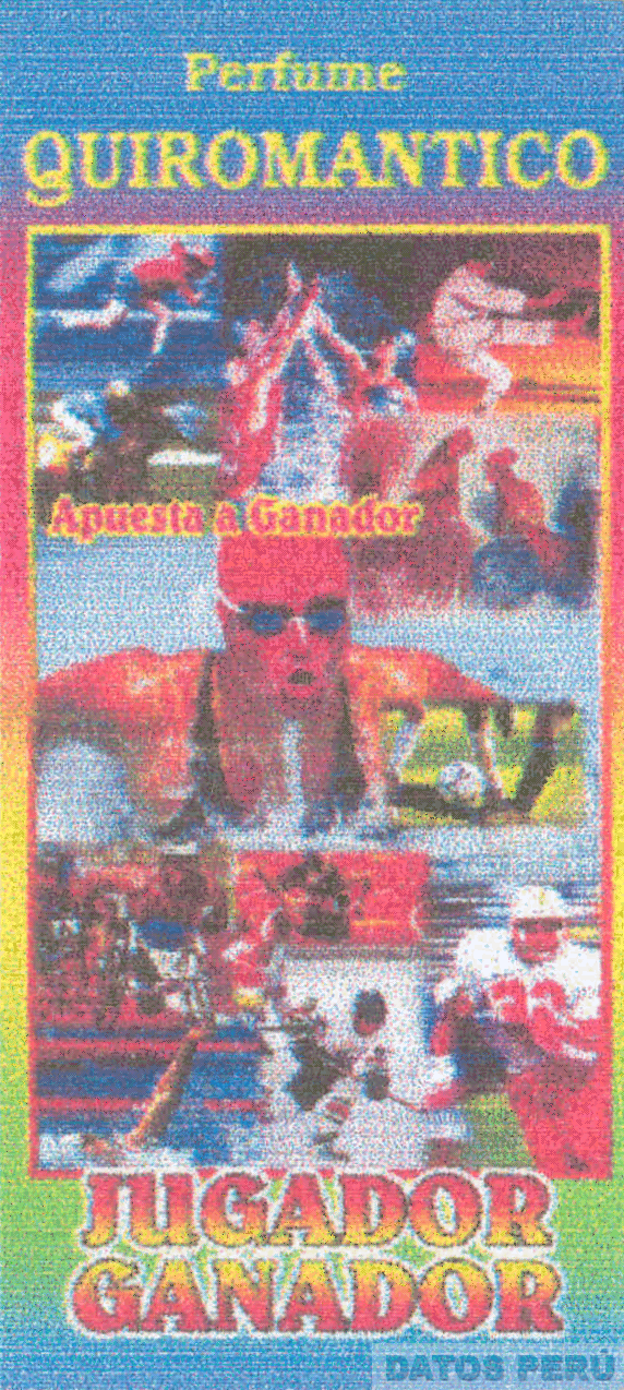 La denominación PERFUME QUIROMANTICO escrita en letras características, seguido de una serie de figuras que incluye diversos eventos deportivos, dentro de ellas la frase APUESTA A GANADOR escrita en letras características, en la parte inferior las palabras JUGADOR GANADOR escrita en letras características, todo en los colores celeste, amarillo, rojo, verde, azul, negro, marrón y blanco; conforme al modelo adjunto