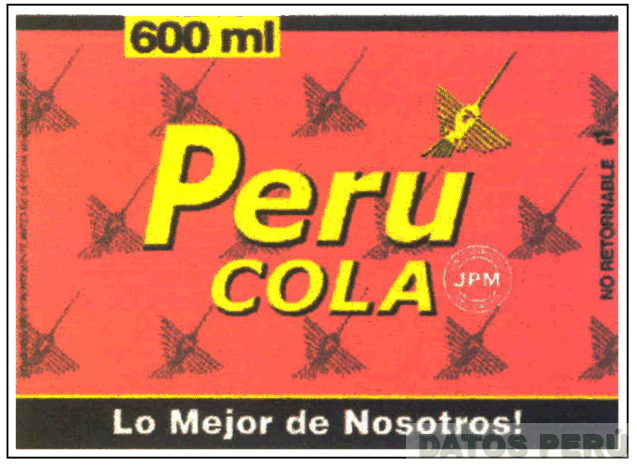 La denominación PERU COLA escrita en letras características sobrepuesta en un fondo donde se aprecia la representación estilizada de una figura Nazca (colibrí) y una figura circular conteniendo las letras estilizadas JPM, la frase LO MEJOR DE NOSOTROS! escrita en letras características, y demás leyendas alusivas al producto, todo en los colores rojo, amarillo, blanco y negro; conforme al modelo