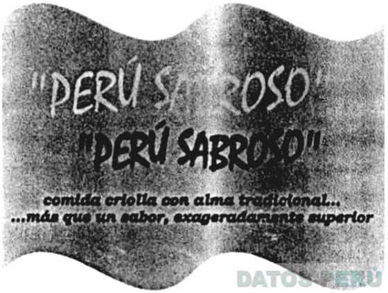 La denominación PERU SABROSO escrita en letras características y debajo la frase COMIDA CRIOLLA CON ALMA TRADICIONAL ... MAS QUE UN SABOR, EXAGERADAMENTE SUPERIOR; conforme al modelo adjunto