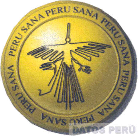 El logotipo conformado por la figura estilizada de una circunferencia en forma de moneda en cuyo interior figura la denominación en color negro de PERU SANA en seis repeticiones alrededor de la misma sobre una segunda circunferencia que encierra la figura de un colibrí similar al de las líneas de Nazca (sin reivindicar); en los colores dorado y negro; conforme al modelo adjunto
