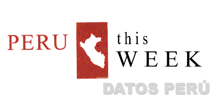 La denominación PERU THIS WEEK escrita en letras características, en la parte central la representación estilizada del mapa del Perú, dentro de una figura rectangular, en los colores negro y granate; conforme al modelo adjunto