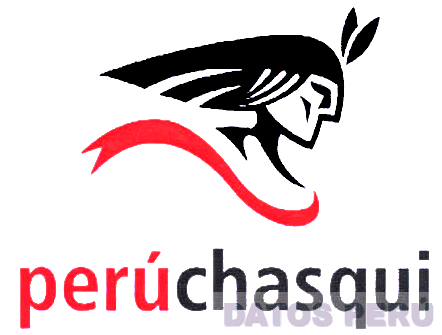 La denominación PERÚCHASQUI escrita en letras características en color rojo y negro, en la parte superior la figura de la cabeza de una persona con dos plumas sobre la frente, todo de color negro, así como una línea semi curva de color rojo debajo de la figura de la cabeza; conforme al modelo adjunto