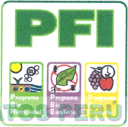 El logotipo conformado por el término PFI escrito en letras características, debajo se aprecia tres figuras rectangulares, en una de ellas se ubica la representación del sol, una planta, el suelo, agua y fertilizantes; en la siguiente, la figura de una hoja carcomida e insectos a su alrededor, sobre un círculo con una línea oblicua en su interior; finalmente, en la última se aprecia la figura de una manzana, un racimo de uvas y un reloj; debajo de cada una se aprecia frases alusivas al producto, todo dentro de una figura cuadrangular, en los colores verde, amarillo, morado, rojo, azul, marrón, blanco y negro; conforme al modelo adjunto