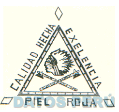 LA ETIQUETA CON LA DENOMINACION PIEL ROJA CALIDAD HECHA EXELENCIA (SIC), LA FIGURA ESTILIZADA DEL PERFIL DE LA CABEZA DE UN PIEL ROJA, ENCIMA DE DOS HACHAS CRUZADAS DENTRO DE UN TRIANGULO CON LA APARIENCIA DE ESTAR COSIDO, Y EN LOS VERTICES LA FIGURA DE UN ROMBO, CONFORME AL MODELO - SIN REIVINDICAR CALIDAD HECHA EXELENCIA-