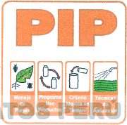 El logotipo conformado por el término PIP escrito en letras características, debajo se aprecia cuatro figuras rectangulares, en una de ellas se aprecia la figura de una hoja carcomida y dos insectos; en la siguiente, la representación de dos envases y dos flechas, en la siguiente, un envase grande y uno pequeño que simula que se vierte el contenido, y una flecha; y finalmente en el último, la representación de un sembradío y una regadera, debajo de cada una se aprecia frases alusivas al producto, todo dentro de una figura cuadrangular, en los colores amarillo, anaranjado, verde, rojo, negro y blanco; conforme al modelo adjunto