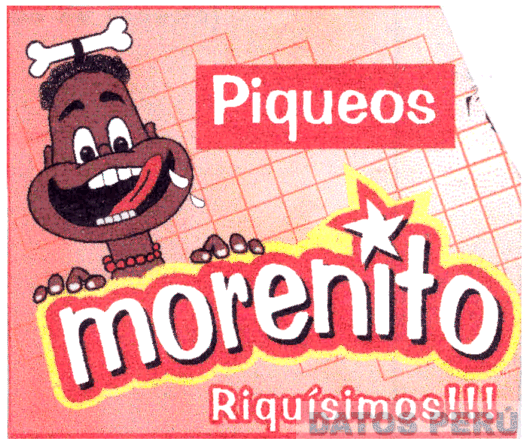 EL LOGOTIPO CONFORMADO POR LA DENOMINACIÓN PIQUEOS MORENITO ESCRITA EN LETRAS CARACTERÍSTICAS Y LA REPRESENTACIÓN ESTILIZADA DE LA CABEZA DE UN CANIBAL, TODO EN LOS COLORES MARRÓN, ROJO, BLANCO Y AMARILLO; CONFORME AL MODELO ADJUNTO