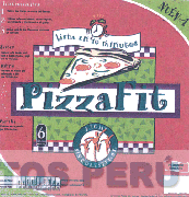 El logotipo conformado por la denominación PIZZAFIT escrita en letras características dentro de una figura rectangular, sobre ella la figura de una porción de pizza y debajo un círculo que contiene figuras irregulares, todo sobrepuesto a una figura cuadrangular que a su vez contiene varias líneas verticales y horizontales; en la parte superior se observa la frase LISTA EN 10 MINUTOS y sobre ella un reloj estilizado; asimismo, se aprecian varias frases alusivas al producto; todo dentro de un cuadrado; en los colores rojo, blanco, negro, morado, anaranjado, amarillo y distintas tonalidades de verde; conforme al modelo adjunto