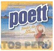 La denominación POETT BAÑO DE SOL escrita en letras características sobre un fondo paisajístico en el que una mujer mira el mar, en los colores blanco, azul, amarillo, beige, rojo, turquesa; conforme al modelo adjunto