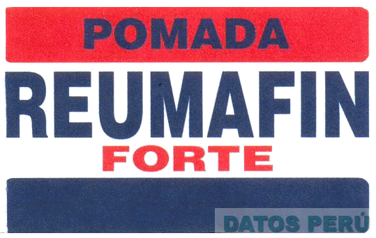 El logotipo conformado por dos franjas horizontales en donde se aprecia la denominación POMADA REUMAFIN FORTE escrita en letras características, todo en la combinación de colores rojo, azul y blanco; conforme al modelo adjunto