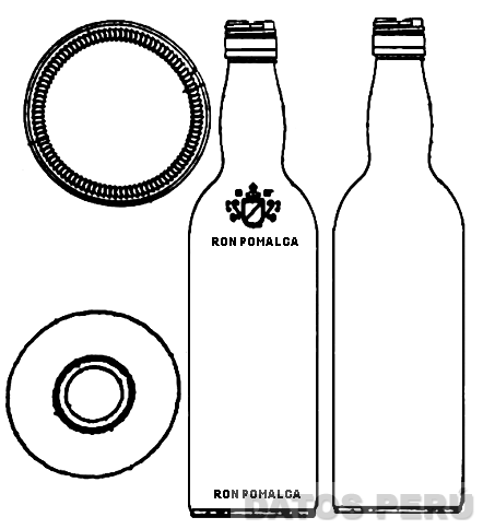 EL ENVASE CARACTERISTICO CON BOCA REDONDA; SIGUIENDO CON UN CUELLO ALTO EN FORMA DE CONO CONVEXO Y CONO CONCAVO, CERRANDOSE Y ASI FORMANDO UNA LIGERA CINTURA; PARA LUEGO ABRIRSE HACIA EL EXTERIOR Y FORMAR LOS HOMBROS EN FORMA DE CONO CONVEXO; SIGUIENDO A ESTE CON UN CUERPO CILINDRICO; TERMINANDO EN UN CONO CONCAVO Y BASE REDONDA LLEVANDO EN ALTO RELIEVE UN ESCUDO Y LA DENOMINACION RON POMALCA, QUE SE REPITE EN LA PARTE INFERIOR, SIN REIVINDICAR EL TERMINO RON Y LA FORMA DEL ENVASE, CONFORME AL MODELO ADJUNTO,
