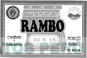 El logotipo conformado por la denominación RAMBO escrita en letras características sobrepuesta a la representación de una bolsa chequera, y demás frases alusivas al producto; al lado superior izquierdo se aprecia el diseño estilizado de una circunferencia de bordes irregulares conteniendo una figura romboide con las letras PR escritas en forma característica, y al lado superior derecho una figura circular con la representación de un paisaje; conforme al modelo adjunto
