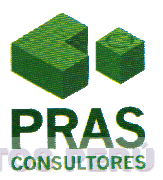 El logotipo conformado por la denominación PRAS CONSULTORES escrita en letras características, en la parte superior se aprecia una figura irregular y un cubo, el cual presenta tres flechas que forman una figura circular, todo en color verde en diversas tonalidades; conforme al modelo adjunto