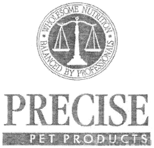 El logotipo conformado por la denominación PRECISE escrita en letras características en color negro, debajo y dentro de una franja de color negro aparece la frase PET PRODUCTS escrita en letras características en color blanco; en la parte superior aparece una figura circular que contiene la frase WHOLESOME NUTRITION BALANCE BY PROFESSIONALS escrita en letras características y en el centro la figura de una balanza sobre un fondo negro; conforme al modelo adjunto