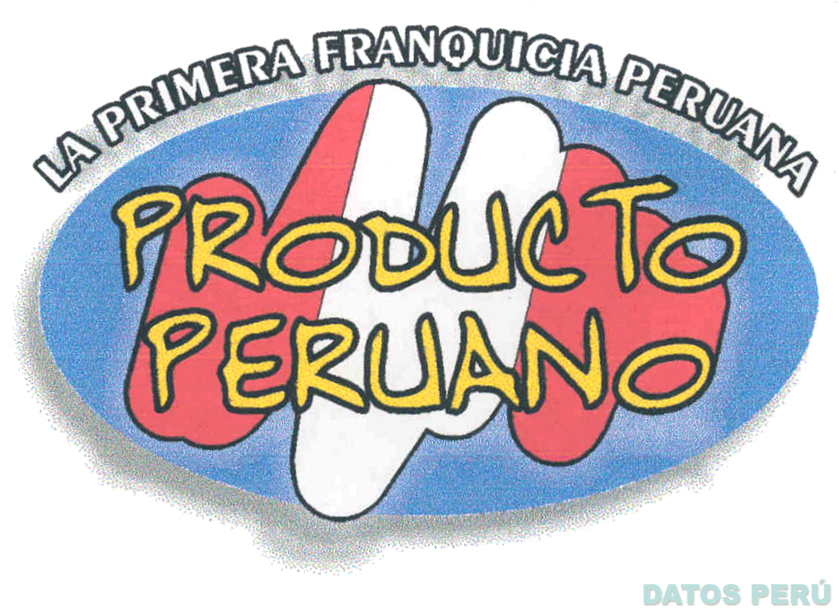 El logotipo constituido por una bandera peruana estilizada, sobre un fondo color azul, y la denominación PRODUCTO PERUANO escrita en letras características de color amarillo, sobre la cual se aprecia la denominación LA PRIMERA FRANQUICIA PERUANA escrita en letras características; conforme al modelo adjunto (sin reivindicar LA PRIMERA FRANQUICIA PERUANA)