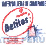LA ETIQUETA CONFORMADA POR LA MARCA BETITOS, CON LETRAS AZULES, UN CORAZON ROJO CON LAS LETRAS M&B EN BLANCO, LA PALABRA PRODUCTOS EN ROJO, 3 ESTRELLAS ROJAS TODO ESTO DENTRO DE UN ELIPSOIDE CON FONDO BLANCO Y MARCO ROJO, CON LAS LETRAS JA JA EN AZUL EN LA PARTE INFERIOR DERECHA DEL ELIPSOIDE JUNTO CON UNA GALLETA WAFER ROJA CON SOMBRAS AZUL OSCURO Y AZUL CLARO