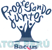 El logotipo conformado por la denominación PROGRESANDO JUNTOS, acompañada de la representación estilizada de dos figuras humanizadas; y en la parte inferior la denominación BACKUS, todo en la combinación de colores azul y rojo; conforme al modelo adjunto