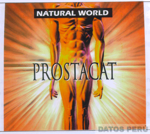 LA ETIQUETA QUE CONTIENE LA FIGURA DE UN CUERPO HUMANO DONDE SE RESALTAN LOS MUSCULOS Y COMO FONDO DE LA ETIQUETA Y PARTIENDO DEL CENTRO APARECE LA REPRESENTACION DE UN DESTELLO LUMINOSO QUE SE EXPANDE. EN LA PARTE CENTRAL APARECE LA DENOMINACION PROSTACAT; EN LA PARTE SUPERIOR SOBRE EL PECHO DE LA FIGURA HUMANA Y DENTRO DE UN RECUADRO SE LEE LA DENOMINACION NATURAL WORLD EN LETRAS BLANCAS, EN SUS COLORES CEPIA, MARRON, ANARANJADO, AMARILLO, FUCSIA, NEGRO Y BLANCO, CONFORME AL MODELO ADJUNTO,