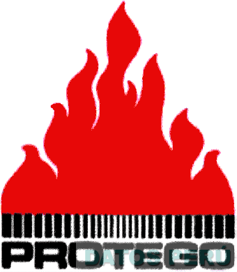 El logotipo conformado por la denominación PROTEGO escrita en letras características sobre el diseño estilizado de una llama de fuego sobre una franja recta dividida en varias partes, todo en los colores rojo y negro; conforme al modelo adjunto