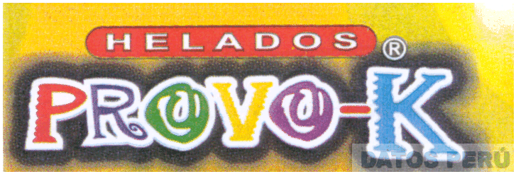 LA DENOMINACION PROVO-K EN LETRAS ESTILIZADAS SOMBREADAS, EN LA COMBINACION DE LOS COLORES ROJO, MORADO, VERDE, AMARILLO, AZUL, BLANCO Y NEGRO, SIN REIVINDICAR EL TERMINO HELADOS, SEGUN EL MODELO ADJUNTO