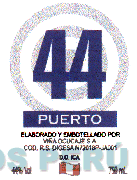 La etiqueta conteniendo la denominación PUERTO escrita en letras características dentro de una figura rectangular, en la parte superior se aprecia el número 44 sobre un fondo de diseños circulares concéntricos, en la parte inferior se aprecia la frase ELABORADO Y EMBOTELLADO POR VIÑA OCUCAJE S.A. escrita en letras características y una figura ondulante dividida en tres secciones, y demás leyendas alusivas al producto, todo en los colores gris, azul, blanco y rojo; conforme al modelo adjunto