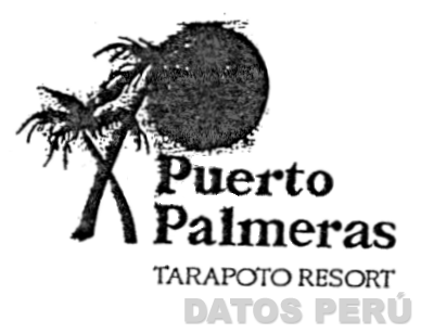 La figura de dos palmeras cruzadas. La palmera que cruza hacia la derecha cubre parte del sol que aparece sobre la denominación PUERTO PALMERAS. Debajo de ello se lee TARAPOTO RESORT según modelo