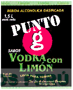 La etiqueta que contiene la denominación PUNTO Y LA LETRA G estilizaa dentro de un círculo, en la parte inferior la frase SABOR VODKA CON LIMÓN escrita en letras características en el borde superior e inferior presenta una franja apreciándose en la franja superior la palabra LIMÓN escrita en letras características en forma repetitiva, y demás leyendas alusivas al producto, en los colores negro, rojo, blanco y verde; conforme al modelo adjunto