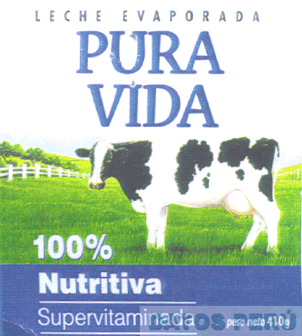 LA ETIQUETA QUE CONTIENE EN SU PARTE SUPERIOR LA DENOMINACION PURA VIDA, ESCRITA EN LETRAS CARACTERISTICAS DE COLOR AZUL Y LA FIGURA CLASICA DE UNA VACA, TODO SOBRE UN CAMPO Y CIELO DE COLORES VERDE, BLANCO Y CELESTE; EN LA PARTE INFERIOR SE APRECIA UNA FRANJA DE COLOR AZUL, TODO CONFORME AL MODELO DEL FACSIMIL ADJUNTO,