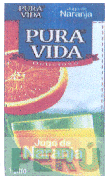 La etiqueta rectangular que presenta la denominación PURA VIDA escrita en letras características contenida en un rectángulo y debajo de ésta una franja, en el fondo se aprecia una naranja partida a la mitad y en la parte inferior un vaso con contenido líquido con la frase JUGO DE NARANJA (sin reivindicar), así como leyendas alusivas al producto (sin reivindicar), todo en los colores azul, blanco, celeste, amarillo, anaranjado en diversas tonalidades, verde, negro y rojo; conforme al modelo adjunto