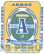 La denominación PRECIOSA escrita en letras características debajo de la cual se aprecia la representación de la letra A y la frase PURO ARROZ escrita en letras características de color azul todo sobre un círculo de fondo verde, en cuya parte inferior se aprecia la denominación LA PRECIOSA, estando la palabra PRECIOSA encerrada dentro de una figura irregular a manera de ribete de color azul, todo ello enmarcado dentro de una figura rectangular de bordes redondeados de color amarillo y borde azul a cuyos lados se aprecia la frase ARROZ SUPERIOR escrita en letras características de color azul; conforme al modelo adjunto