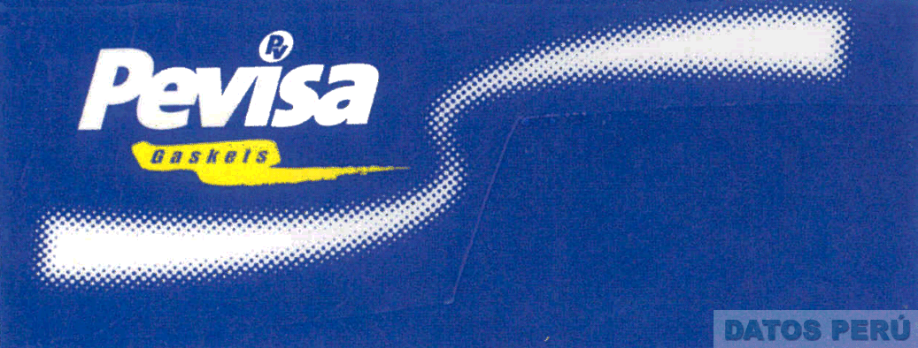 La denominación PEVISA escrita en letras características en color blanco sobre fondo azul, conteniendo el monograma de las letras PV en color azul sobre el punto de la letra I, en la parte inferior aparece la palabra GASKETS en color azul sobre un trazo amarillo y un trazo curvo color blanco en forma de letra S; conforme al modelo adjunto